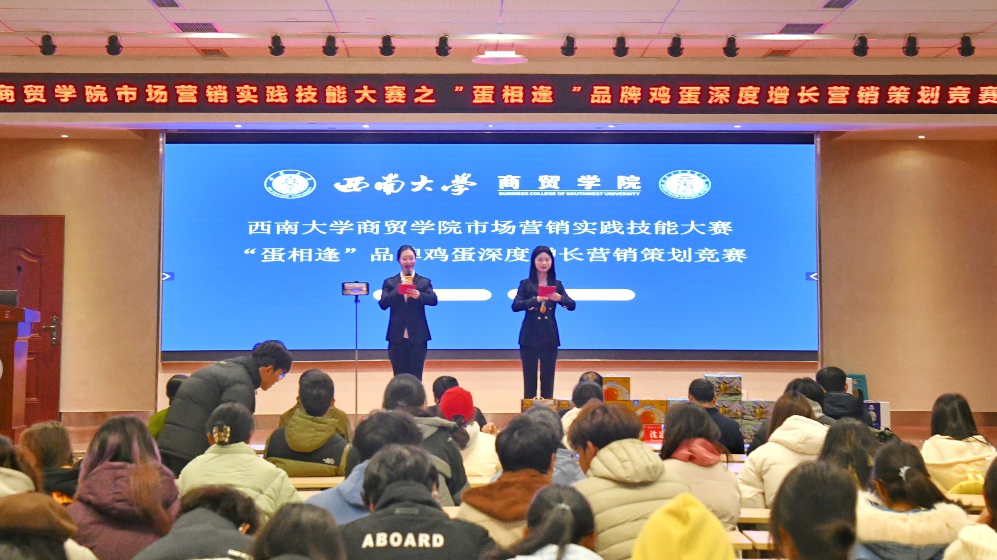 12月6日,市场营销实践技能大赛之“’蛋相逢’品牌鸡蛋深度增长营销策划竞赛”在学院7B101报告厅顺利举行。本次赛事由学院与重庆众信农牧集团、重庆蛋相逢科技有限公司联合主办,旨在深化产教融合、推动理论与实践协同发展,全面提升学生市场营销实战能力,积极服务乡村振兴战略。